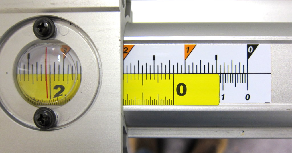 The ruler on the bandsaw fence is just awful. It shows metric and english units and neither are that legible because the numbers are at the top/bottom and the reticule is a large circular bubble. In addition, the ruler doesn't show anything useful if you have the resaw fence on (that adds imprecisely 1 3/8"). I finally bought a stick-on right-left tape measure from Rockler and glued it over the metric units to show the resaw distance. Note the improvement in readability. What ergonomic genius used small black letters on dark orange at the top of a bubble? I'm thinking of taping over the English units as well...